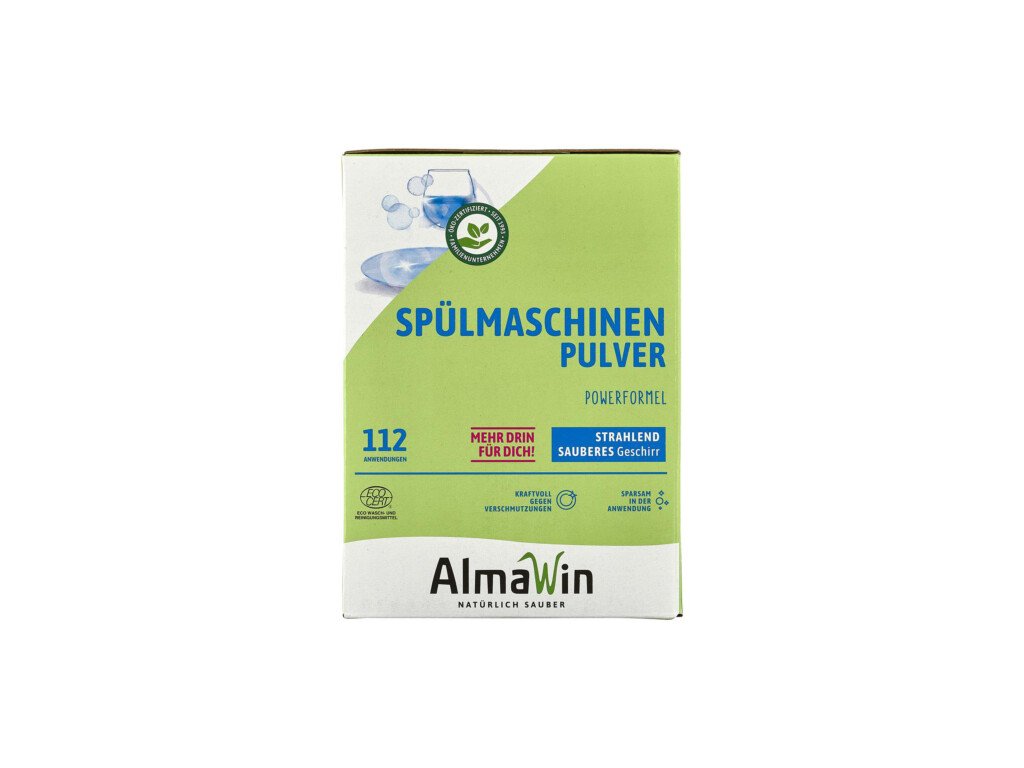 Prášek do myčky AlmaWin má certifikace ECOCERT a Vegan Society. Obsahuje enzymy bez genetických úprav a jako koncentrát je velmi úsporný. Účinně odstraňuje odolné zbytky jídla, tuky, cukry a bílkoviny. Vhodné do všech domácích myček nádobí.Brilantní čistota dosažená zcela přirozeným způsobem: obejdeme se bez fosfátů, chlóru a optických zjasňovačů. Mycí prostředek AlmaWin má certifikace ECOCERT a Vegan Society. Obsahuje enzymy bez genetických úprav a jako koncentrát je velmi úsporný.