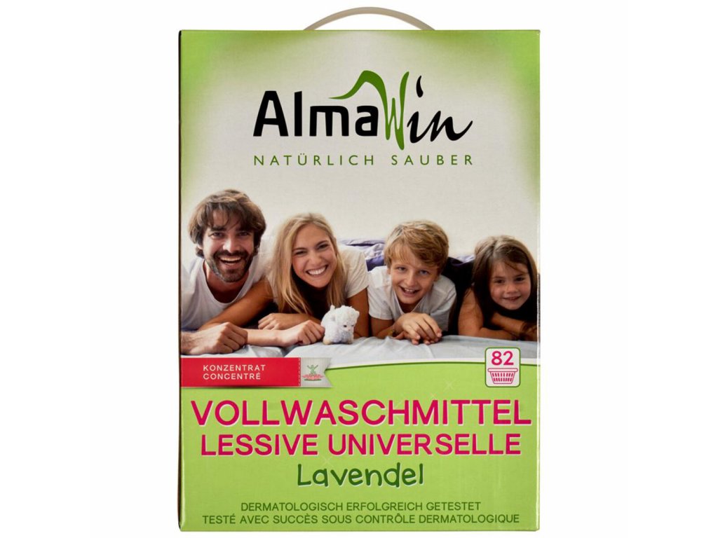 Prací prostředek pro velké zatížení AlmaWin je certifikován a byl úspěšně dermatologicky testován. Neobsahuje žádné syntetické vůně, barviva ani konzervační látky a je bez fosfátů, chlóru a optických zjasňovačů. To zaručuje dobrou snášenlivost pokožky.
