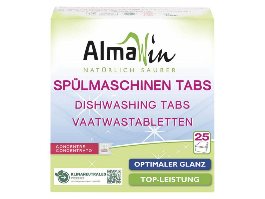 Tablety do myčky AlmaWin neobsahují fosfát ani chlór. Obsahují enzymy bez GMO. Receptura s power formulí zajišťuje dokonalou čistotu a zářivý lesk. Tablety do myčky AlmaWin účinně odstraňují odolné zbytky jídla, tuk, škrob a bílkoviny. Jsou vyrobeny lokálně poblíž Stuttgartu s důrazem na přírodní suroviny. Tablety do myčky AlmaWin jsou veganské a mají certifikaci ECOCERT.